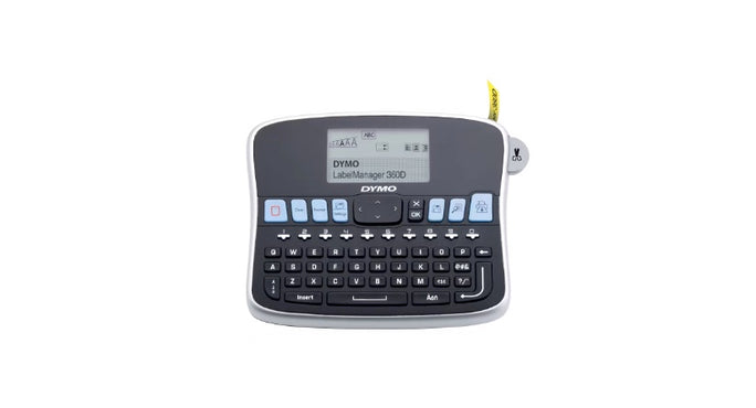 The Dymo LabelManager 360D is a rechargeable, high-performance desktop label maker ideal for home, office, or light industrial use. Powered by a long-lasting Li‑Ion battery, it eliminates the need for AA cells. Featuring a large 2-line graphic LCD that previews your formatting, a familiar QWERTY keyboard, and dedicated formatting keys, it makes label creation fast and precise. With memory for up to 9 labels and support for 6 – 19 mm D1 tapes, it handles a wide variety of labeling tasks—from file folders to storage bins.