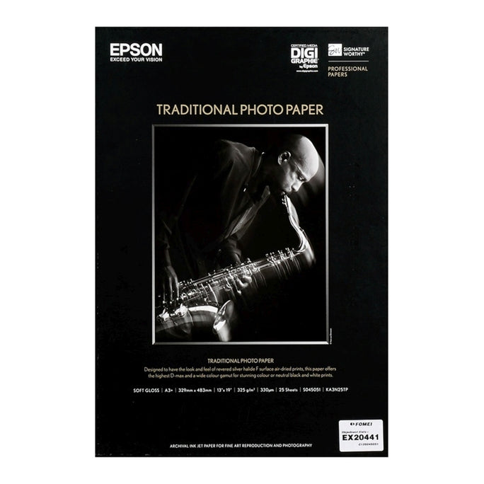 Traditional Photo Paper A3+ 25 Sheets is designed for professional photography. Acid and lignin free with a MicroPorous Smooth Gloss Surface (F-Type) that has a minimum gloss differential. Fast drying. optimised for Epson UltraChrome pigment ink.